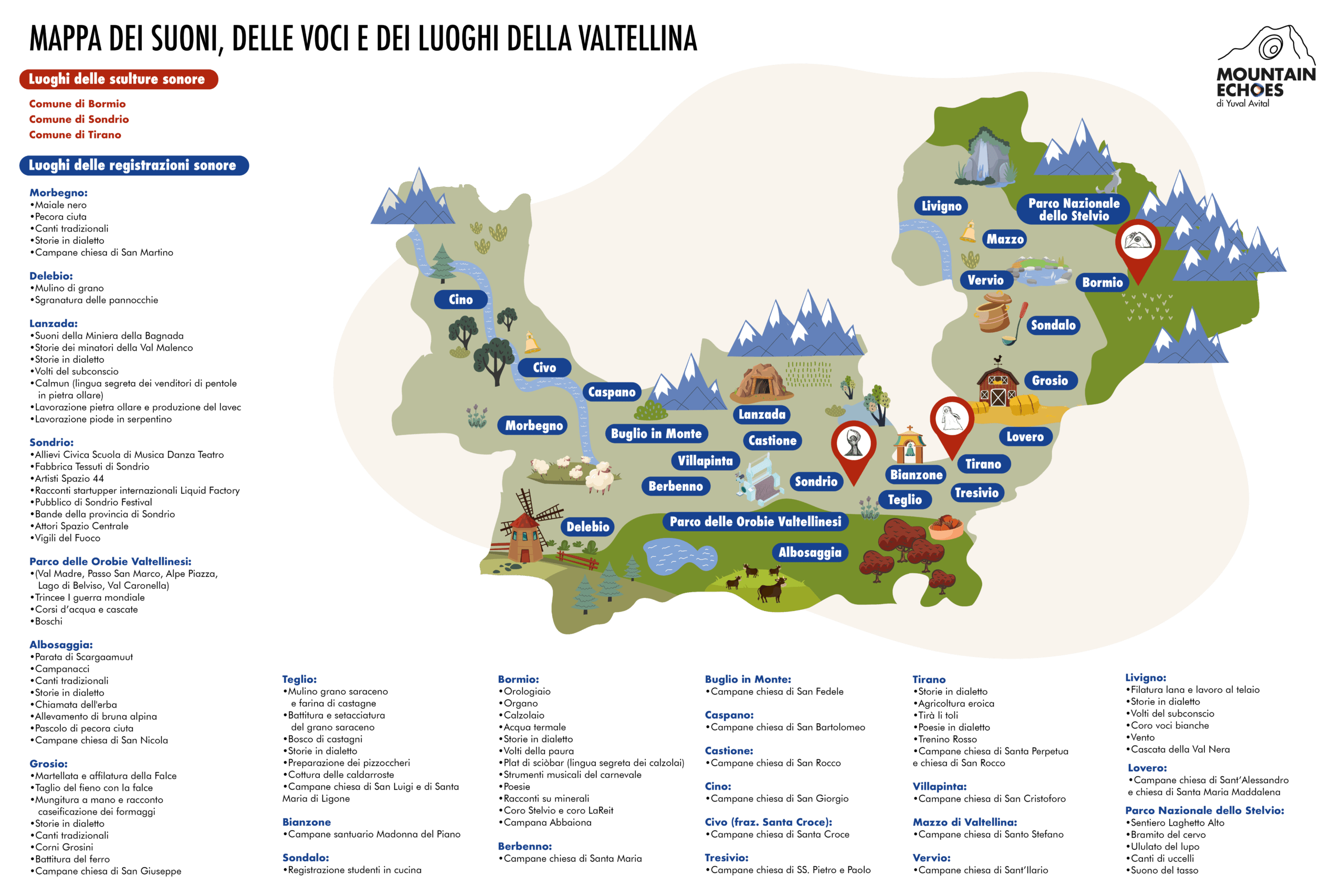 La mappa di MOUNTAIN ECHOES nasce dal viaggio di Yuval Avital in Valtellina. È una lettura interpretativa del territorio, costruita attraverso i luoghi che hanno generato suoni, le persone che hanno condiviso voce e memoria e i paesaggi che hanno fatto da cornice al progetto. La sua parzialità riflette la straordinaria ricchezza del territorio, impossibile da abbracciare interamente, e proprio per questo preziosa. Fondamentale è stato il ruolo dei “Virgili” locali, che hanno guidato Avital tra percorsi, incontri e ascolti, dando forma a questa mappa.